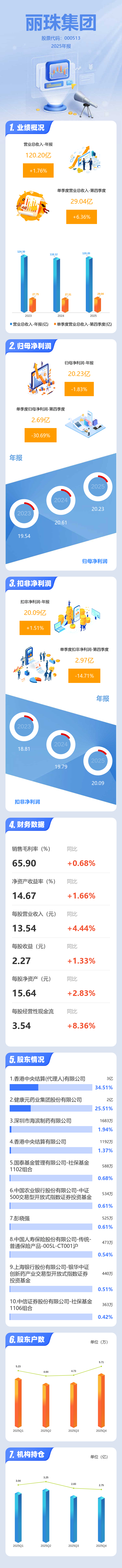 证券之星消息,丽珠集团2025年年报显示,当年度公司主营收入120.2亿元,同比上升1.76%;归母净利润20.23亿元,同比下降1.84%;扣非净利润20.09亿元,同比上升1.51%;其中2025年第四季度,公司单季度主营收入29.04亿元,同比上升6.36%;单季度归母净利润2.69亿元,同比下降30.7%;单季度扣非净利润2.97亿元,同比下降14.71%;负债率35.18%,投资收益5006.93万元,财务费用-2.13亿元,毛利率65.9%。
