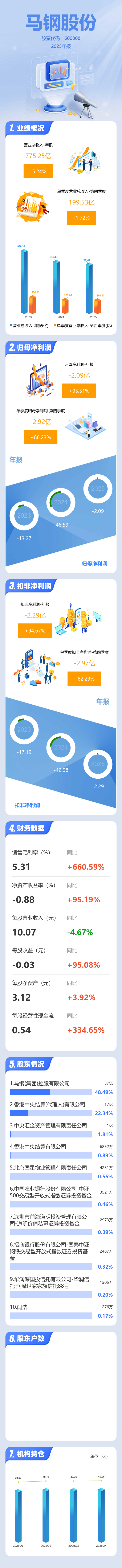 证券之星消息,马钢股份2025年年报显示,当年度公司主营收入775.25亿元,同比下降5.25%;归母净利润-2.09亿元,同比上升95.52%;扣非净利润-2.29亿元,同比上升94.68%;其中2025年第四季度,公司单季度主营收入199.53亿元,同比下降1.73%;单季度归母净利润-2.92亿元,同比上升86.23%;单季度扣非净利润-2.97亿元,同比上升82.29%;负债率55.67%,投资收益-6178.26万元,财务费用4.08亿元,毛利率5.31%。
