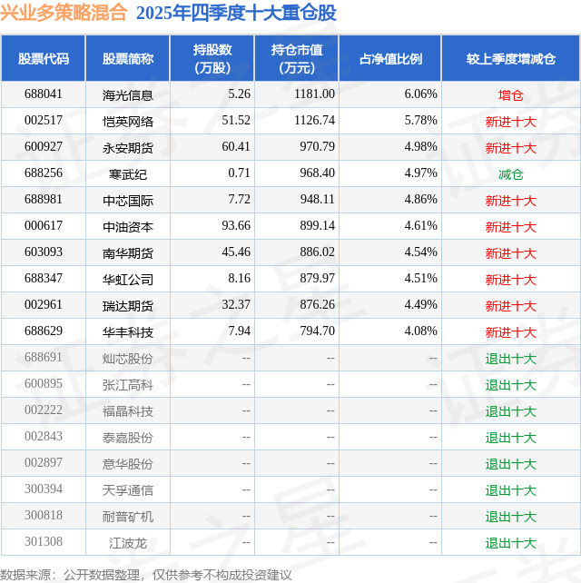 兴业多策略混合的前十大重仓股如下: