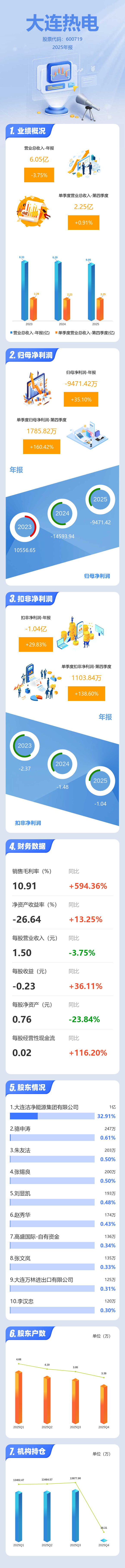 证券之星消息,大连热电2025年年报显示,当年度公司主营收入6.05亿元,同比下降3.76%;归母净利润-9471.42万元,同比上升35.1%;扣非净利润-1.04亿元,同比上升29.83%;其中2025年第四季度,公司单季度主营收入2.25亿元,同比上升0.92%;单季度归母净利润1785.82万元,同比上升160.43%;单季度扣非净利润1103.84万元,同比上升138.61%;负债率88.04%,财务费用7846.2万元,毛利率10.91%。