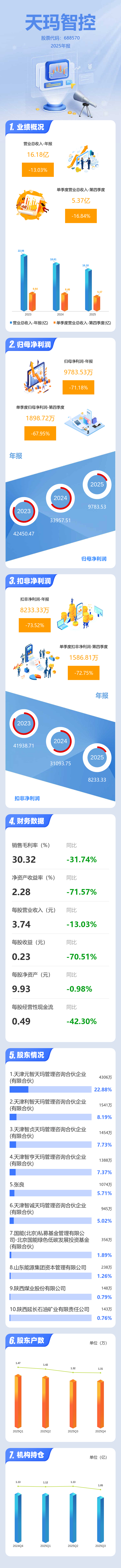 证券之星消息,天玛智控2025年年报显示,当年度公司主营收入16.18亿元,同比下降13.03%;归母净利润9783.53万元,同比下降71.19%;扣非净利润8233.33万元,同比下降73.52%;其中2025年第四季度,公司单季度主营收入5.37亿元,同比下降16.84%;单季度归母净利润1898.72万元,同比下降67.95%;单季度扣非净利润1586.81万元,同比下降72.76%;负债率26.47%,投资收益685.17万元,财务费用-2963.81万元,毛利率30.32%。