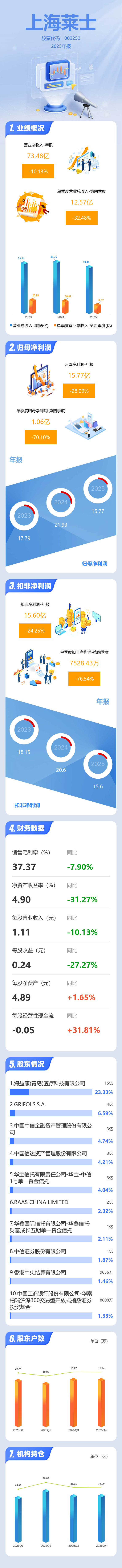 证券之星消息,上海莱士2025年年报显示,当年度公司主营收入73.48亿元,同比下降10.13%;归母净利润15.77亿元,同比下降28.1%;扣非净利润15.6亿元,同比下降24.25%;其中2025年第四季度,公司单季度主营收入12.57亿元,同比下降32.49%;单季度归母净利润1.06亿元,同比下降70.1%;单季度扣非净利润7528.43万元,同比下降76.54%;负债率14.1%,投资收益3.53亿元,财务费用-4192.41万元,毛利率37.37%。
