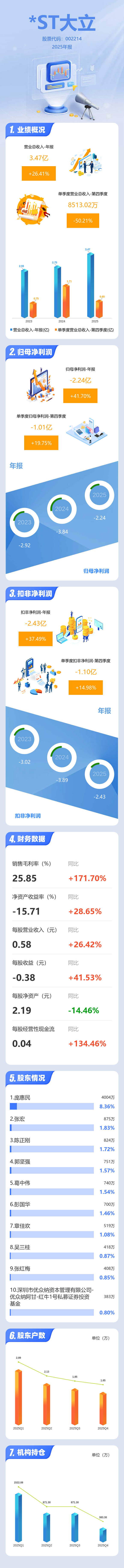 证券之星消息,*ST大立2025年年报显示,当年度公司主营收入3.47亿元,同比上升26.41%;归母净利润-2.24亿元,同比上升41.7%;扣非净利润-2.43亿元,同比上升37.5%;其中2025年第四季度,公司单季度主营收入8513.02万元,同比下降50.21%;单季度归母净利润-1.01亿元,同比上升19.76%;单季度扣非净利润-1.1亿元,同比上升14.99%;负债率36.75%,投资收益-8.54万元,财务费用880.24万元,毛利率25.85%。