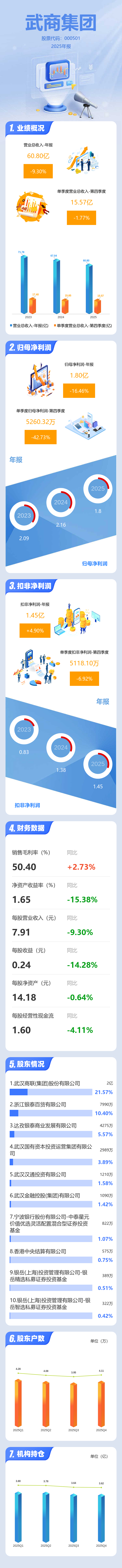 证券之星消息,武商集团2025年年报显示,当年度公司主营收入60.8亿元,同比下降9.31%;归母净利润1.8亿元,同比下降16.46%;扣非净利润1.45亿元,同比上升4.91%;其中2025年第四季度,公司单季度主营收入15.57亿元,同比下降1.78%;单季度归母净利润5260.32万元,同比下降42.74%;单季度扣非净利润5118.1万元,同比下降6.92%;负债率64.1%,投资收益1807.01万元,财务费用2.18亿元,毛利率50.4%。