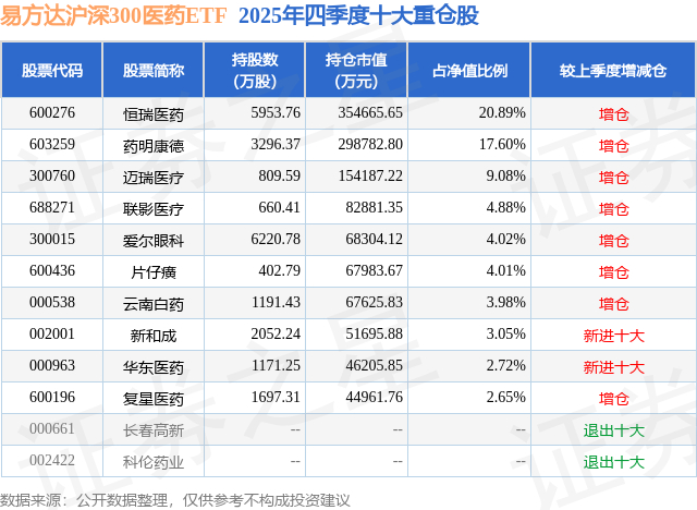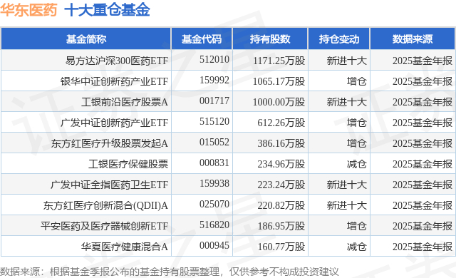 根据2025基金年报公募基金重仓股数据,重仓该股的公募基金共53家,其中持有数量最多的公募基金为易方达基金的易方达沪深300医药ETF。易方达沪深300医药ETF目前规模为169.74亿元,最新净值0.3518(3月26日),较上一交易日下跌1.81%,近一年下跌0.19%。该公募基金现任基金经理为余海燕。余海燕在任的基金产品包括:易方达沪深300非银ETF,管理时间为2014年6月26日至今,期间收益率为140.84%;易方达证券保险ETF联接A,管理时间为2015年1月22日至今,期间收益率为8.1%;易方达沪深300ETF联接A,管理时间为2016年4月16日至今,期间收益率为72.79%。