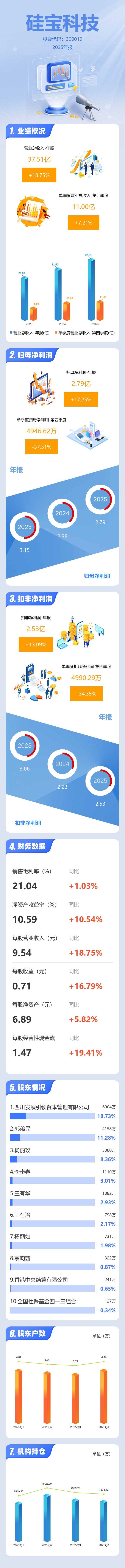 证券之星消息,硅宝科技2025年年报显示,当年度公司主营收入37.51亿元,同比上升18.75%;归母净利润2.79亿元,同比上升17.25%;扣非净利润2.53亿元,同比上升13.09%;其中2025年第四季度,公司单季度主营收入11.0亿元,同比上升7.22%;单季度归母净利润4946.62万元,同比下降37.51%;单季度扣非净利润4990.29万元,同比下降34.36%;负债率33.96%,投资收益249.4万元,财务费用297.57万元,毛利率21.04%。