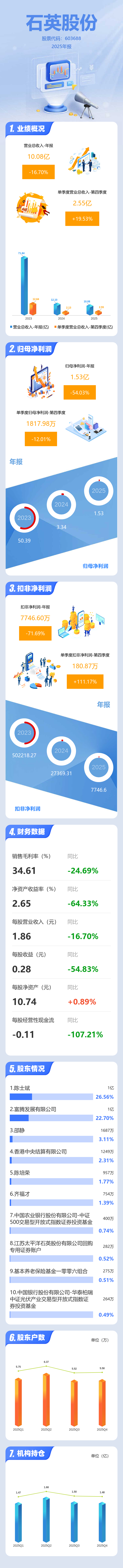证券之星消息,石英股份2025年年报显示,当年度公司主营收入10.08亿元,同比下降16.71%;归母净利润1.53亿元,同比下降54.03%;扣非净利润7746.6万元,同比下降71.7%;其中2025年第四季度,公司单季度主营收入2.55亿元,同比上升19.53%;单季度归母净利润1817.98万元,同比下降12.01%;单季度扣非净利润180.87万元,同比上升111.18%;负债率4.92%,投资收益83.67万元,财务费用130.21万元,毛利率34.61%。