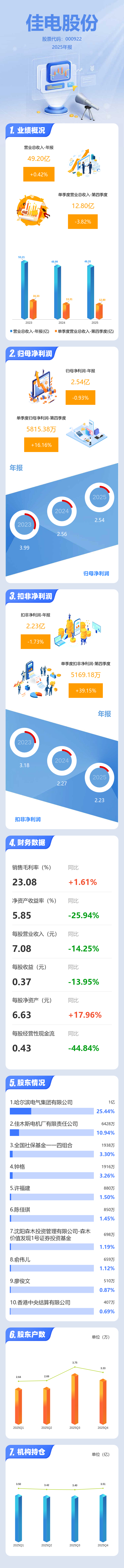 证券之星消息,佳电股份2025年年报显示,当年度公司主营收入49.2亿元,同比上升0.42%;归母净利润2.54亿元,同比下降0.94%;扣非净利润2.23亿元,同比下降1.74%;其中2025年第四季度,公司单季度主营收入12.8亿元,同比下降3.83%;单季度归母净利润5815.38万元,同比上升16.17%;单季度扣非净利润5169.18万元,同比上升39.15%;负债率48.43%,投资收益19.41万元,财务费用1356.79万元,毛利率23.08%。