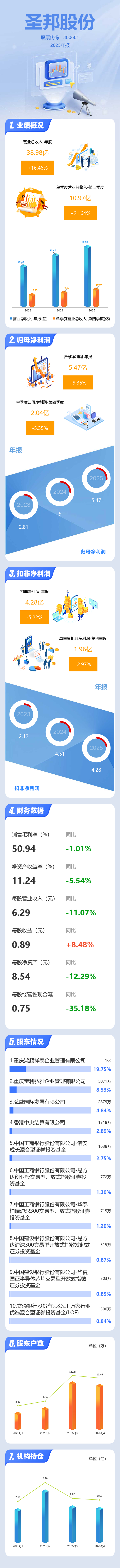 证券之星消息,圣邦股份2025年年报显示,当年度公司主营收入38.98亿元,同比上升16.46%;归母净利润5.47亿元,同比上升9.36%;扣非净利润4.28亿元,同比下降5.23%;其中2025年第四季度,公司单季度主营收入10.97亿元,同比上升21.65%;单季度归母净利润2.04亿元,同比下降5.35%;单季度扣非净利润1.96亿元,同比下降2.98%;负债率23.4%,投资收益2616.43万元,财务费用-857.34万元,毛利率50.94%。