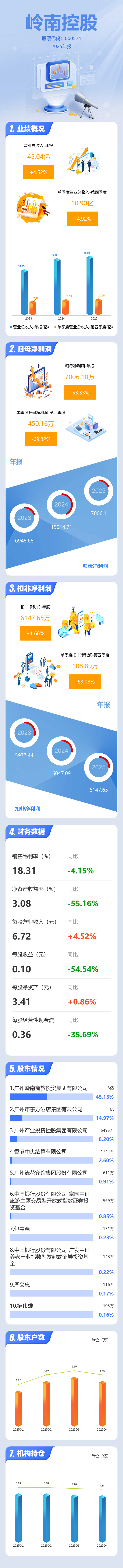 证券之星消息,岭南控股2025年年报显示,当年度公司主营收入45.04亿元,同比上升4.52%;归母净利润7006.1万元,同比下降53.34%;扣非净利润6147.65万元,同比上升1.66%;其中2025年第四季度,公司单季度主营收入10.9亿元,同比上升4.92%;单季度归母净利润450.16万元,同比下降69.83%;单季度扣非净利润108.89万元,同比下降63.09%;负债率40.28%,投资收益-328.69万元,财务费用-887.9万元,毛利率18.31%。