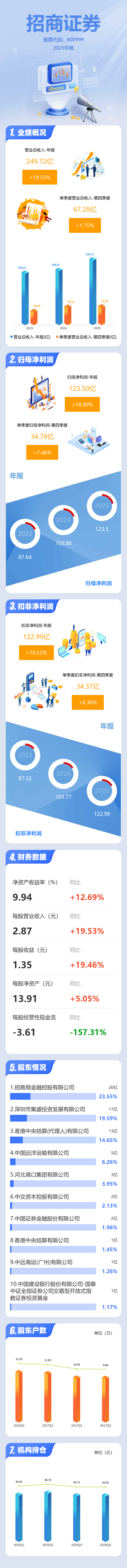 证券之星消息,招商证券2025年年报显示,当年度公司主营收入249.72亿元,同比上升19.53%;归母净利润123.5亿元,同比上升18.91%;扣非净利润122.99亿元,同比上升18.52%;其中2025年第四季度,公司单季度主营收入67.28亿元,同比上升1.75%;单季度归母净利润34.78亿元,同比上升7.47%;单季度扣非净利润34.37亿元,同比上升6.36%;负债率81.68%,投资收益124.0亿元。