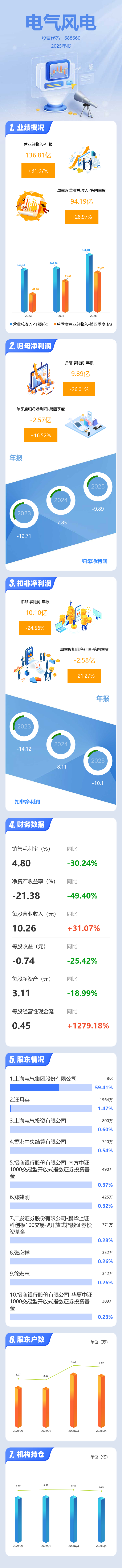 证券之星消息,电气风电2025年年报显示,当年度公司主营收入136.81亿元,同比上升31.07%;归母净利润-9.89亿元,同比下降26.01%;扣非净利润-10.1亿元,同比下降24.57%;其中2025年第四季度,公司单季度主营收入94.19亿元,同比上升28.97%;单季度归母净利润-2.57亿元,同比上升16.52%;单季度扣非净利润-2.58亿元,同比上升21.27%;负债率87.98%,投资收益2.36亿元,财务费用1.57亿元,毛利率4.8%。