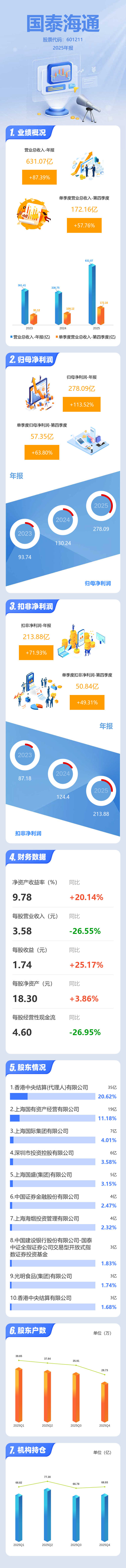 证券之星消息,国泰海通2025年年报显示,当年度公司主营收入631.07亿元,同比上升87.4%;归母净利润278.09亿元,同比上升113.52%;扣非净利润213.88亿元,同比上升71.93%;其中2025年第四季度,公司单季度主营收入172.16亿元,同比上升57.77%;单季度归母净利润57.35亿元,同比上升63.81%;单季度扣非净利润50.84亿元,同比上升49.31%;负债率83.63%,投资收益267.0亿元。