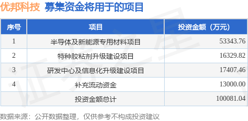 证券之星消息,东莞优邦材料科技股份有限公司(简称:优邦科技)拟在深交所创业板上市,募资总金额为8.05亿元,保荐机构为申万宏源证券承销保荐有限责任公司。募集资金拟用于半导体及新能源专用材料项目、研发中心建设项目、补充流动资金,详见下表: