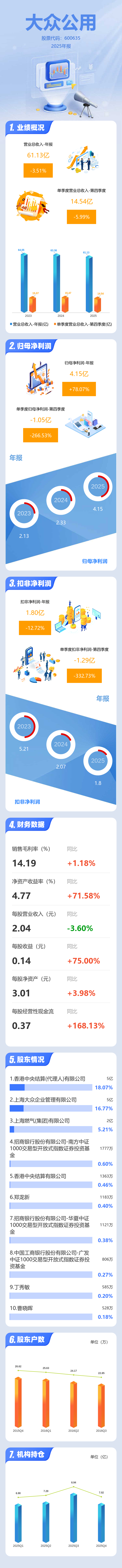 证券之星消息,大众公用2025年年报显示,当年度公司主营收入61.13亿元,同比下降3.51%;归母净利润4.15亿元,同比上升78.07%;扣非净利润1.8亿元,同比下降12.73%;其中2025年第四季度,公司单季度主营收入14.54亿元,同比下降5.99%;单季度归母净利润-1.05亿元,同比下降266.54%;单季度扣非净利润-1.29亿元,同比下降332.74%;负债率55.13%,投资收益7.2亿元,财务费用1.74亿元,毛利率14.19%。