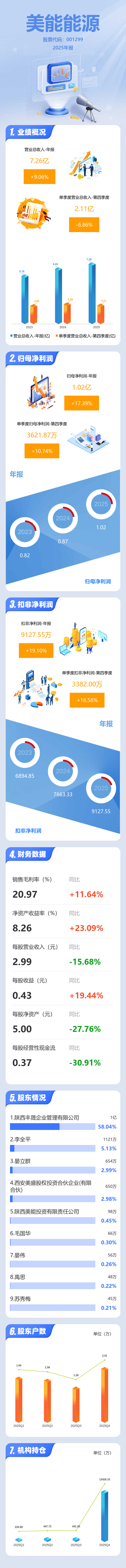 证券之星消息,美能能源2025年年报显示,当年度公司主营收入7.26亿元,同比上升9.07%;归母净利润1.02亿元,同比上升17.4%;扣非净利润9127.55万元,同比上升19.11%;其中2025年第四季度,公司单季度主营收入2.11亿元,同比下降6.86%;单季度归母净利润3621.87万元,同比上升10.75%;单季度扣非净利润3382.0万元,同比上升16.58%;负债率29.52%,投资收益1477.6万元,财务费用-358.39万元,毛利率20.97%。