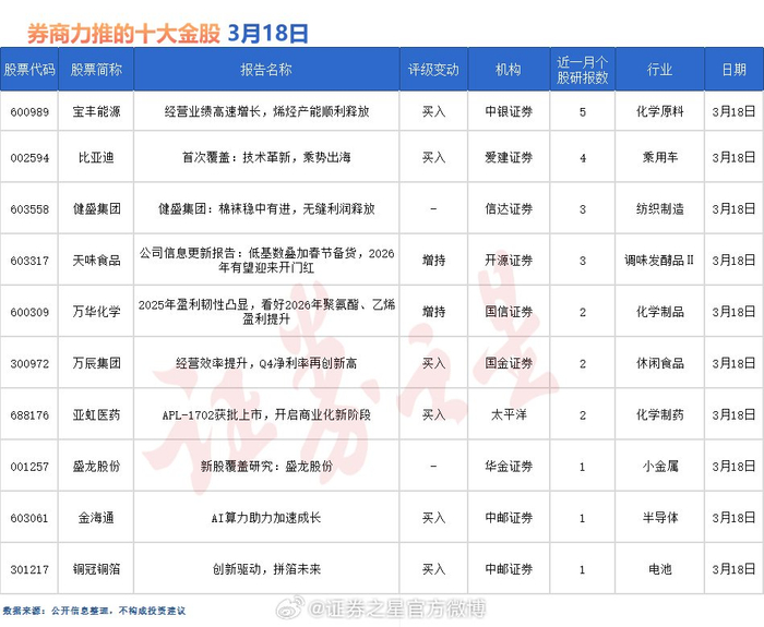 比亚迪也备受券商关注,近一个月获东吴证券、华金证券、开源证券等4份券商研报关注,位居3月18日券商力推股榜第二。
