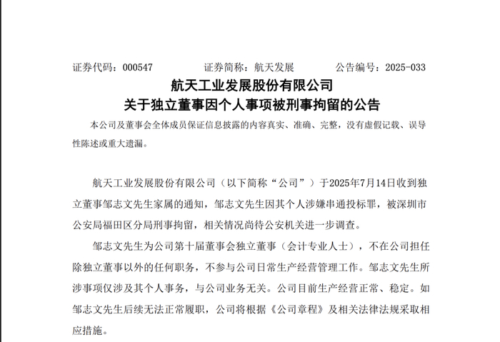 7月14日,航天发展(000547)公告称,公司收到独立董事邹志文家属通知,邹志文因个人涉嫌串通投标罪,被深圳市公安局福田区分局刑事拘留,相关情况尚待公安机关进一步调查。