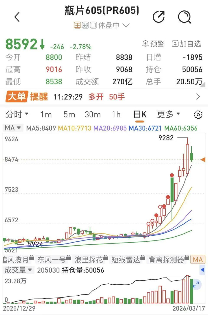 资料显示,三房巷主营产品以瓶级聚酯切片(瓶片)、PTA的生产与销售为核心,以PBT工程塑料、热电的生产与销售等业务为补充。期货盘面上,郑商所瓶片期货主力合约近期持续上攻,3月16日盘中最高触及9282元/吨,3月以来累计涨幅约40%。