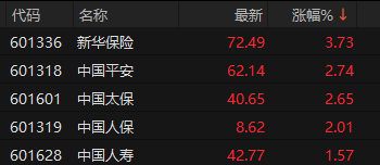 早盘,大金融板块整体强势,保险股涨势突出。截至午间收盘,申万保险行业指数上涨2.68%,新华保险涨超3%,中国平安、中国太保、中国人保涨超2%。