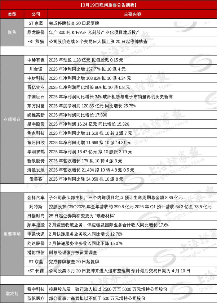 (备注:数据截至19日21:30,后续公告内容请下载上证报APP在快讯栏目查看;或在微信首页菜单“上证财讯”中查看。)