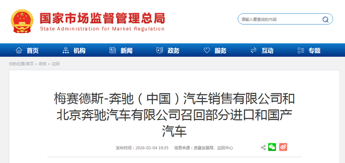 召回编号S2026M0011V:自即日起,召回生产日期从2020年4月22日至2021年10月29日期间的部分国产A级、GLA和GLB汽车,共计53辆。