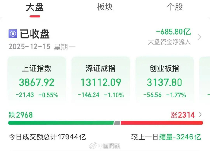 中国商报(记者 王彤旭)12月15日,A股三大指数集体飘绿。截至收盘,上证指数跌0.55%,深证成指跌1.1%,创业板指跌1.77%,北证50跌1.09%。全市场成交1.79万亿元,较上一交易日缩量3246亿元。