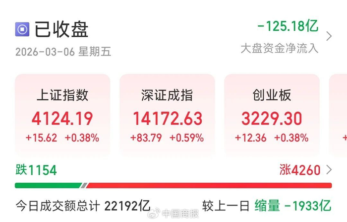 中国商报(记者 马文博)3月6日,A股三大指数集体上涨。截至收盘,上证指数涨0.38%,深成指涨0.59%,创业板指涨0.38%,北证50指数涨0.01%。沪深京三市成交22192亿元,较上一日缩量1933亿元,三市超4200只个股上涨。