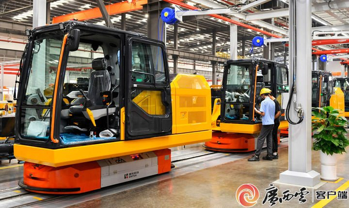柳工挖掘机智慧工厂有轨制导车辆装配线。(资料图)在柳州市,柳工挖掘机智慧工厂自动化产线上,机器人精准协作,让制造效率显著提升、生产成本明显下降;
