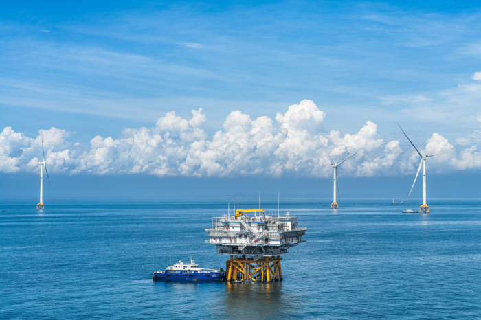 广西防城港海上风电示范项目。东兴市融媒体中心供图北部湾海域,广投集团旗下广西能源集团建设的广西防城港海上风电示范项目A场址,83台风电机昼夜旋转,从项目投产至2025年9月累计发电量超15亿千瓦时。