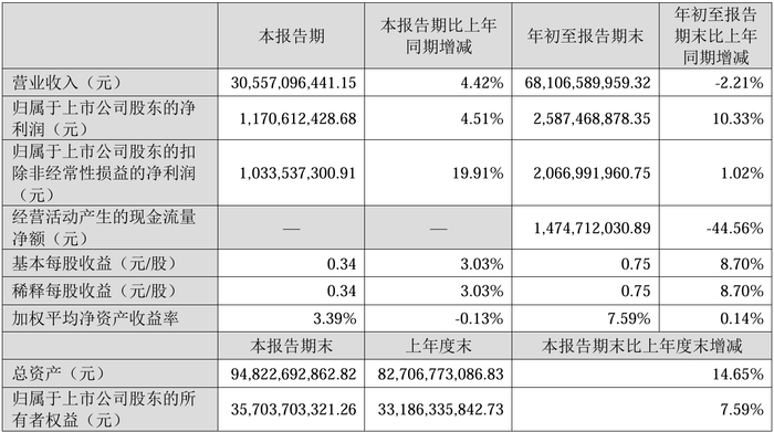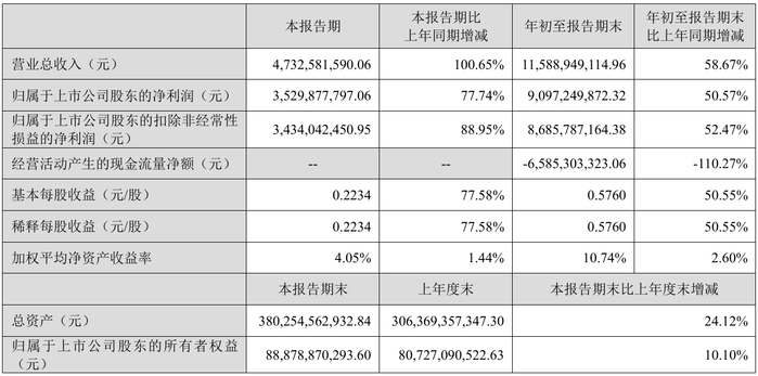 洛阳钼业(603993.SH)公告称,公司第三季度营业收入为507.13亿元,同比下降2.36%;归属于上市公司股东的净利润为56.08亿元,同比增长96.40%。前三季度,公司营业收入为1454.85亿元,同比下降5.99%;归属于上市公司股东的净利润为142.80亿元,同比增长72.61%。主要产品价格同比上升,叠加铜产品产销量同比实现增长,实现利润同比上升。