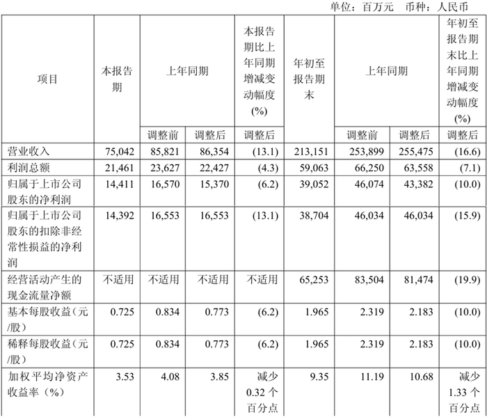 平安银行(000001.SZ)公告称,第三季度营收为312.83亿元,同比下降9.2%;净利润为134.69亿元,同比下降2.8%。前三季度营收为1006.68亿元,同比下降9.8%;净利润为383.39亿元,同比下降3.5%。