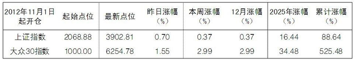本报综合消息 本周,大盘呈现探底回升的走势,上证综指上涨0.37%,深证成指上涨1.26%,创业板指上涨1.86%,大众30指数上涨2.99%。