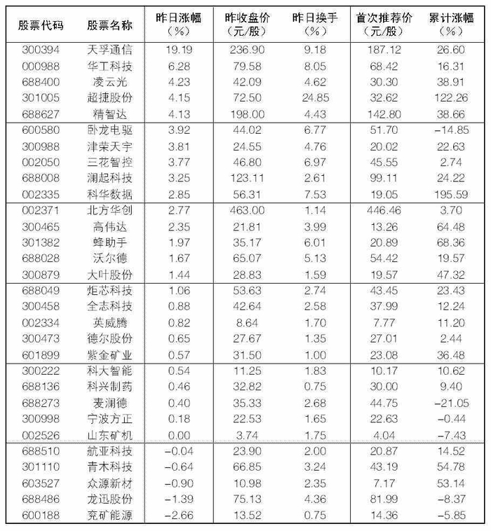 大众30指数成份股中,8日涨幅前五位的分别是天孚通信、华工科技、凌云光、超捷股份、精智达,涨幅分别为19.19%、6.28%、4.23%、4.15%和4.13%;跌幅榜上,兖矿能源、龙迅股份、众源新材、青木科技等跌幅居前。