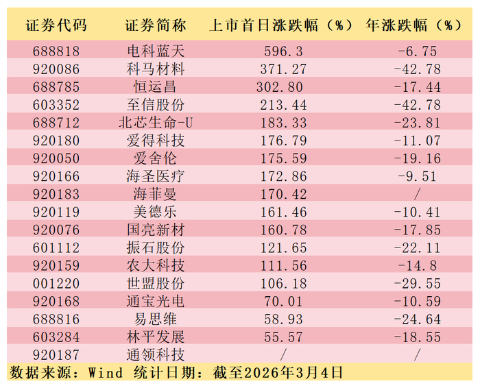 不过,需要注意的是,新股潜在的高回报固然极具吸引力,但随之而来的投资风险也不容忽视。据Wind数据,截至2026年3月4日,今年上市的新股(剔除3月4日刚上市的海菲曼)年涨跌幅几乎全部为负,仅有陕西旅游实现微涨。