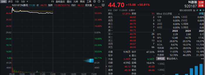 盘中最高涨逾65%,今日,主营汽车零配件业务、国家级专精特新“小巨人”企业通领科技正式登陆北交所。截至午间收盘,该股股价暂报44.70元/股,上涨50.91%。