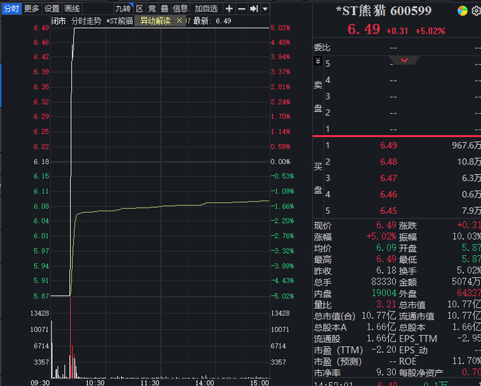停牌五个交易日后,今日“出关”的*ST熊猫(600599)股价上演“撑杆跳”,9时48分前后,随着多笔大单涌入,该股股价于6分钟内从跌停板直冲涨停板,上演“地天板”行情。