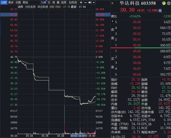 华达科技(603358)则成为本周跌幅王,单周跌幅为32.34%。3月23日至3月26日,该股连续四个交易日跌停,将2024年7月以来的涨幅尽数收回,其间更是三次登上龙虎榜。