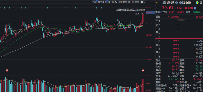 27日,锂矿龙头、千亿元市值上市公司赣锋锂业(002460)收获涨停,该股全天成交金额突破100亿元,位列全市场第五。与此同时,另一锂矿“巨无霸”天齐锂业(002466)大涨近7%,另有多只锂电产业链个股成功封板。