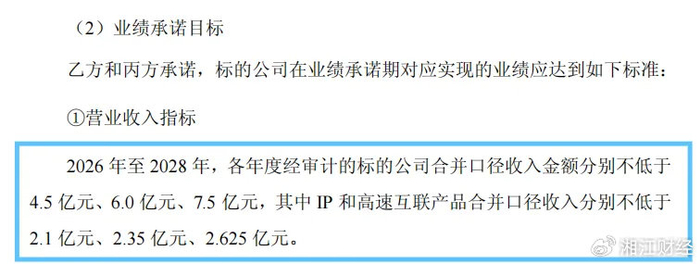 为了给这场豪赌“上保险”,双方签订了一份颇具“看点”的业绩对赌协议:2026年至2028年,奎芯科技各年度营收分别不低于4.5亿元、6亿元、7.5亿元,其中IP和高速互联产品收入需分别不低于2.1亿元、2.35亿元、2.625亿元,且各年度归母净利润均为正。