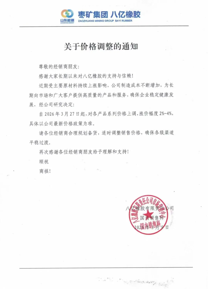 八亿橡胶则将自2026年3月27日起,对各产品系列价格上调,涨价幅度为2%-4%。万达宝通轮胎将自2026年3月16日起,对公司旗下TBR、PCR、OTR所有品牌及产品系列的开票价格实施上调,调整幅度约为3%至5%。