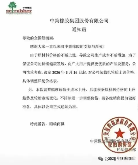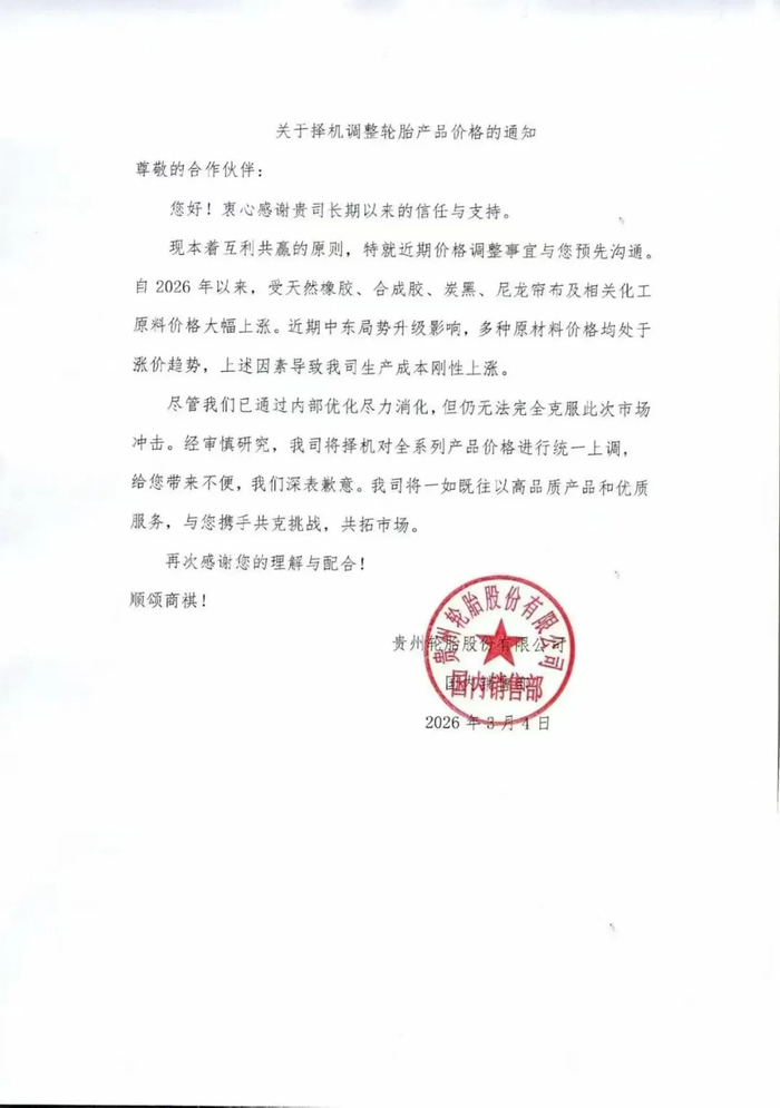 与此同时,贵州轮胎股份有限公司也于2026年3月4日发布通知,明确将择机对全系列产品价格进行统一上调。