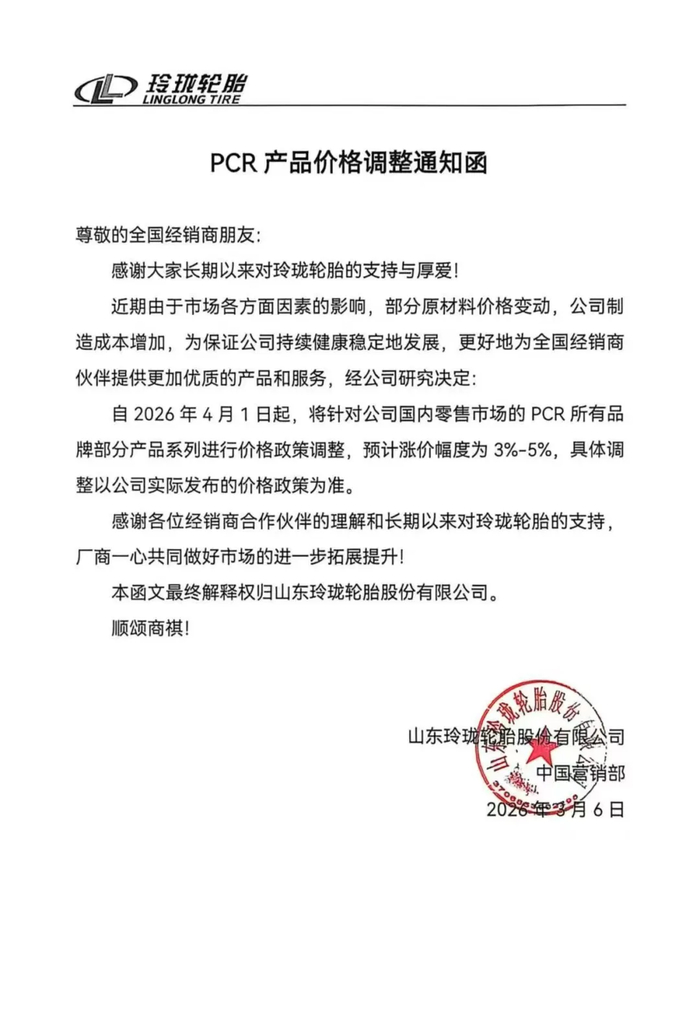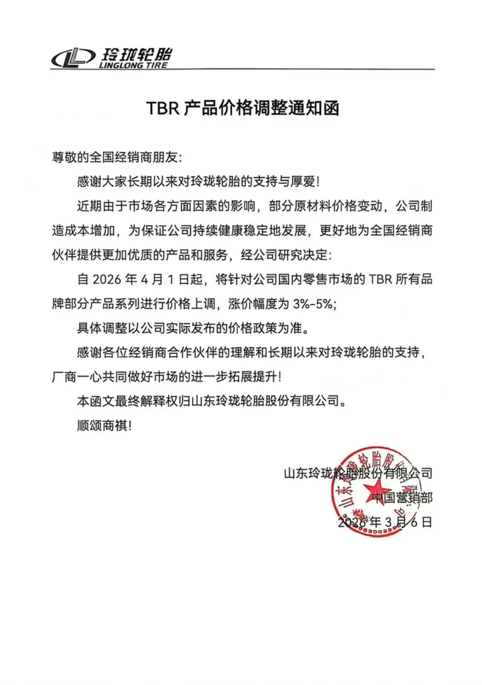 另外,玲珑轮胎也发布了对TBR和PCR产品价格调整的通知,自2026年4月1日起,将针对公司国内零售市场的PCR和TBR所有品牌部分产品涨价3%-5%。