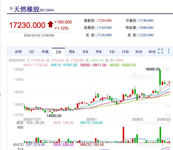 据了解,2026年开年以来,天然橡胶价格呈现大幅攀升态势。受天然橡胶传统停割周期影响,市场供应处于紧张格局,叠加下游需求逐步回暖,推动天然橡胶价格持续走高。2月起价格涨幅进一步加快,3月份突破每吨17000元的高位区间,2月24日当日价格一度攀升至每吨18000元以上,创下阶段性峰值,短短一个多月内,天然橡胶价格同比涨幅已超过10%,且上涨态势仍未得到缓解。