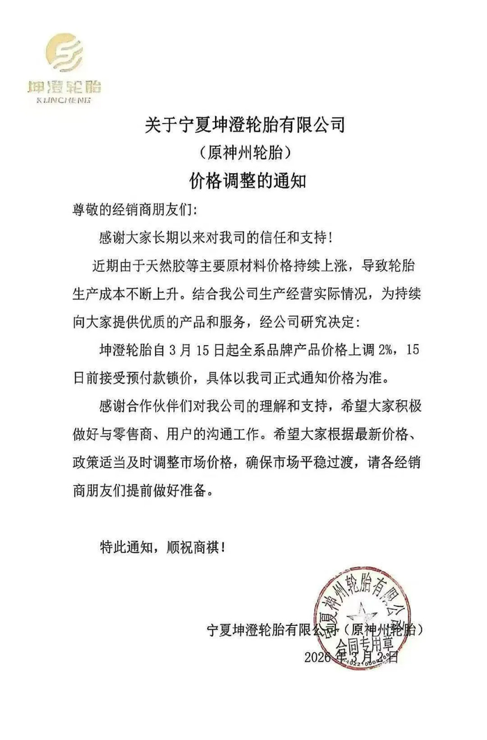 近日,宁夏坤澄轮胎有限公司(原神州轮胎)正式发布价格调整通知,宣布自2026年3月15日起,全系品牌产品价格上调2%,并开通3月15日前预付款锁价通道,具体价格以企业正式通知为准。