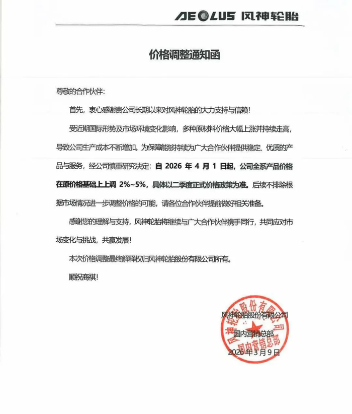 除此之外,3月9日,又有三家轮胎工厂发布涨价通知。其中风神轮胎表示公司将自2026年4月1日起,全系产品价格在原价格基础上上调2%-5%,具体以二季度正式价格政策为准。
