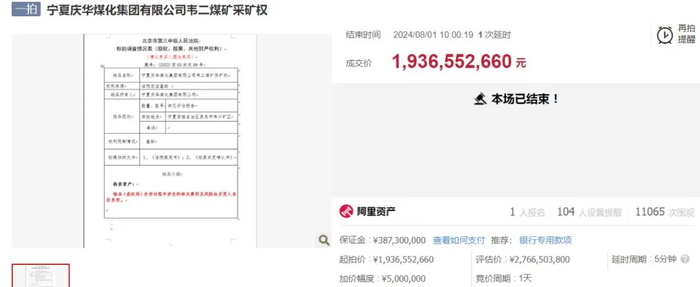 2024年8月1日,淘宝网司法拍卖网络平台显示,“宁夏庆华煤化集团韦二煤矿采矿权”被宁夏瑞鸿能源公司拍下。这一宗采矿权的起拍价为19.37亿元,成交价为19.37亿元,较评估值27.67亿元,相当于打了7折。