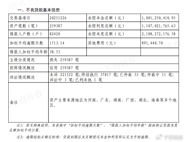 其中,第1期规模最大,未偿本息总额12.58亿元。加权平均逾期天数1513.14天,时间可追溯新冠疫情时期,资产主要来源地区为河南、广东、湖南、广西、湖北、海南等多个地区。