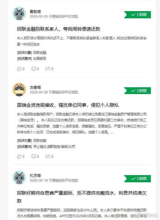 从第三方投诉来看,截至2026年3月27日,第三方投诉平台黑猫投诉[下载黑猫投诉客户端]上关于招联消金的有效投诉量已超过2.9万条,其中近30天投诉量369条。
