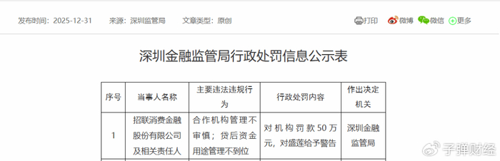 2025年12月,国家金融监督管理总局深圳监管分局发布行政处罚信息,招联消金因合作机构管理不审慎、贷后资金用途管理不到位两项违法违规事实,被处以罚款50万元,相关责任人一并被监管警告。